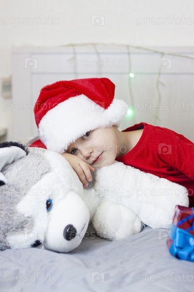 Портрет милого мальчика в шапке Санта-Клауса. Забавный улыбающийся ребенок