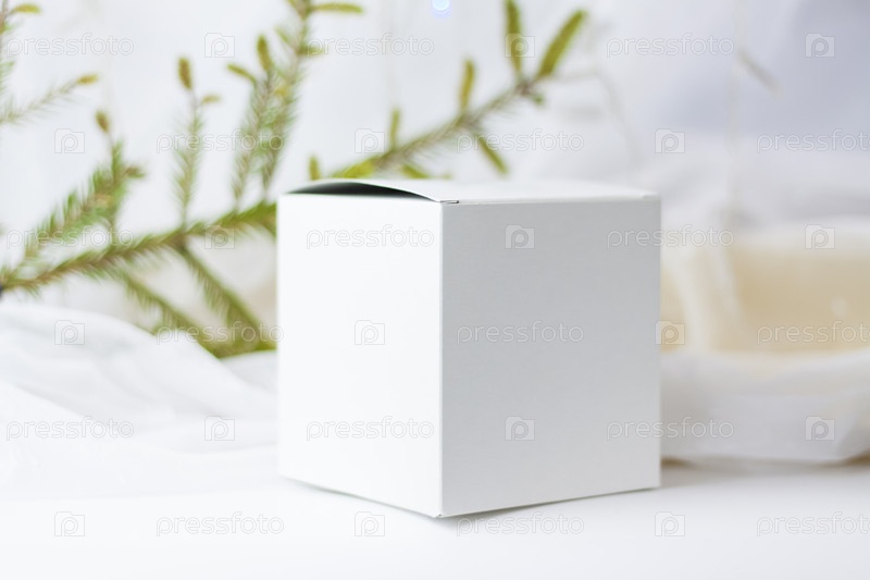 Белая подарочная коробка, шаблон коробки, макет на светлом фоне с веточкой, если. Выборочный фокус. концепция Рождества и Нового года