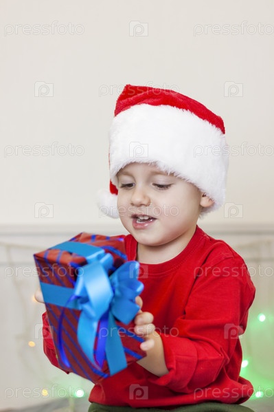 Портрет милого мальчика в шапке Санта-Клауса. Забавный улыбающийся ребенок. Подарки, игрушки, радость, праздник