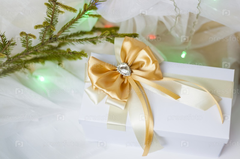 Рождественский подарок, украшенный красивым бантом на светлом фоне с веточкой, если. Выборочный фокус. концепция Рождества и Нового года
