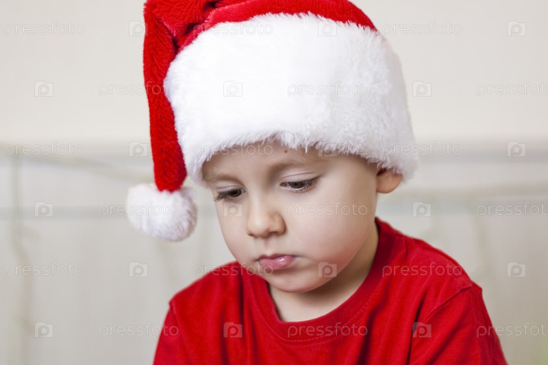 Портрет милого мальчика в шапке Санта-Клауса. Забавный улыбающийся ребенок. Подарки, игрушки, радость, праздник