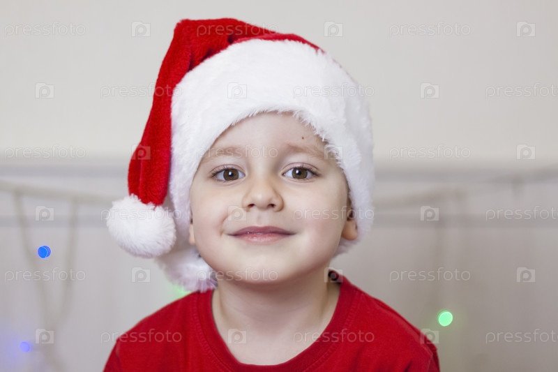 Портрет милого мальчика в шапке Санта-Клауса. Забавный улыбающийся ребенок. Подарки, игрушки, радость, праздник