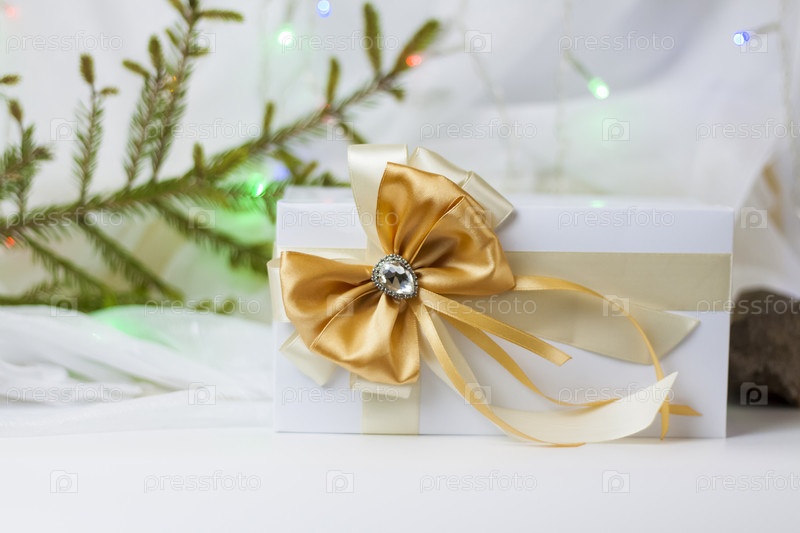 Рождественский подарок, украшенный красивым бантом на светлом фоне с веточкой, если. Выборочный фокус. концепция Рождества и Нового года