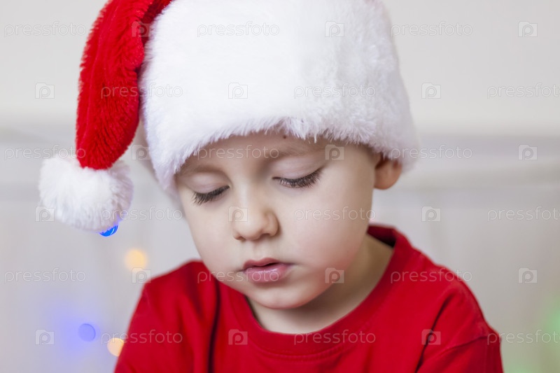 Портрет милого мальчика в шапке Санта-Клауса. Забавный улыбающийся ребенок. Подарки, игрушки, радость, праздник
