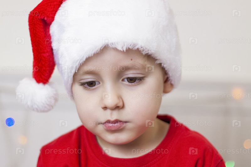 Портрет милого мальчика в шапке Санта-Клауса. Забавный улыбающийся ребенок. Подарки, игрушки, радость, праздник