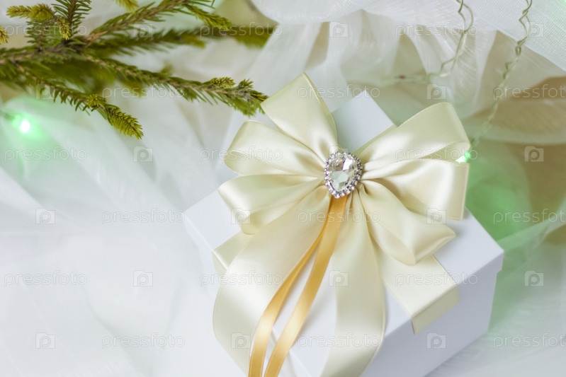 Рождественский подарок, украшенный красивым бантом на светлом фоне с веточкой, если. Выборочный фокус. концепция Рождества и Нового года