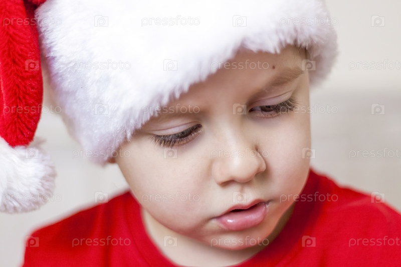 Портрет милого мальчика в шапке Санта-Клауса. Забавный улыбающийся ребенок. Подарки, игрушки, радость, праздник