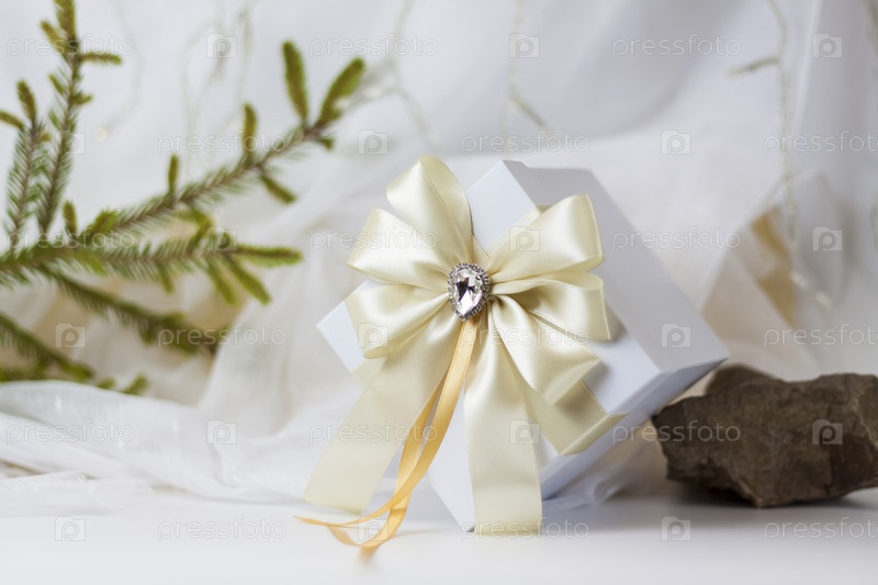 Рождественский подарок, украшенный красивым бантом на светлом фоне с веточкой, если. Выборочный фокус. концепция Рождества и Нового года