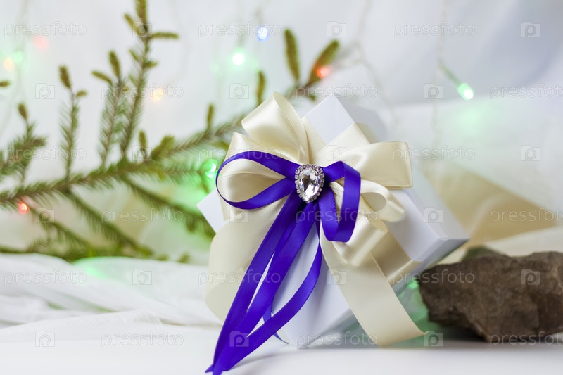 Рождественский подарок, украшенный красивым бантом на светлом фоне с веточкой, если. Выборочный фокус. концепция Рождества и Нового года