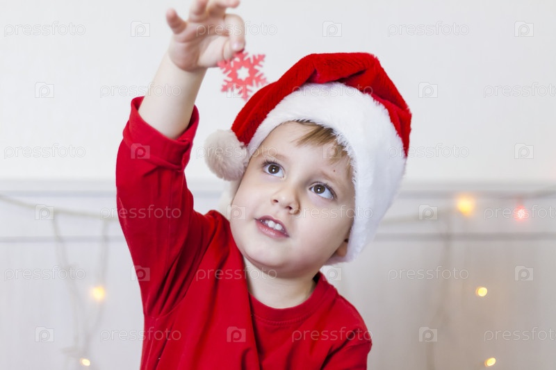 Портрет милого мальчика в шапке Санта-Клауса. Забавный улыбающийся ребенок. Подарки, игрушки, радость, праздник