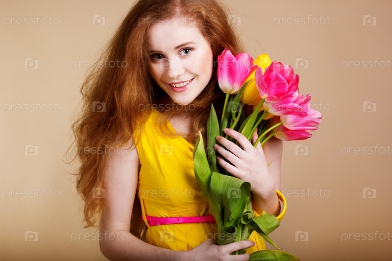 Красивая рыжеволосая девушка с тюльпанами