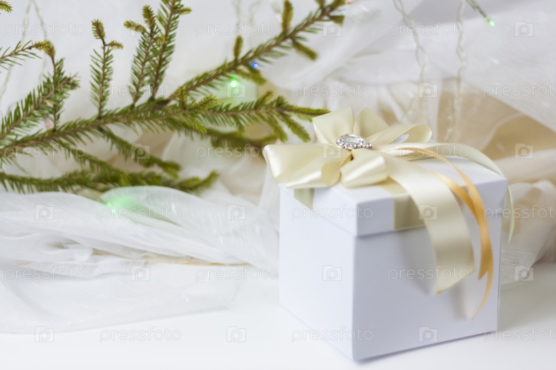 Рождественский подарок, украшенный красивым бантом на светлом фоне с веточкой, если. Выборочный фокус. концепция Рождества и Нового года