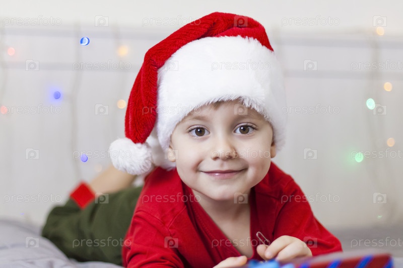 Портрет милого мальчика в шапке Санта-Клауса. Забавный улыбающийся ребенок. Подарки, игрушки, радость, праздник