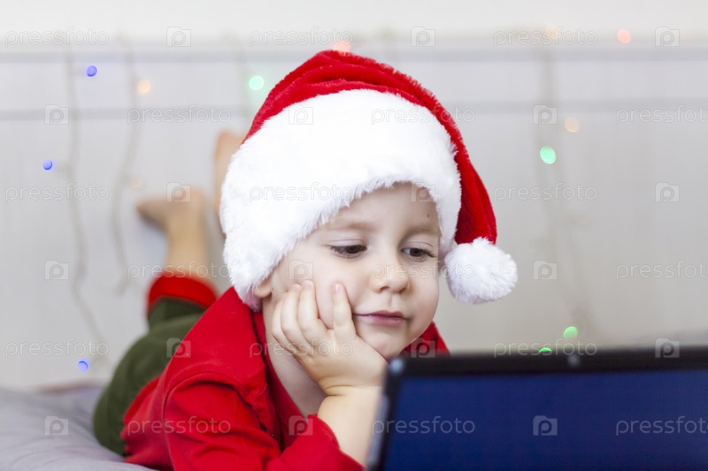 Симпатичный мальчик лежит в постели и смотрит на планшет. Забавный улыбающийся ребенок. В шапке Деда Мороза
