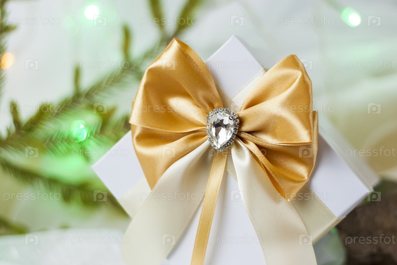Рождественский подарок, украшенный красивым бантом на светлом фоне с веточкой, если. Выборочный фокус. концепция Рождества и Нового года