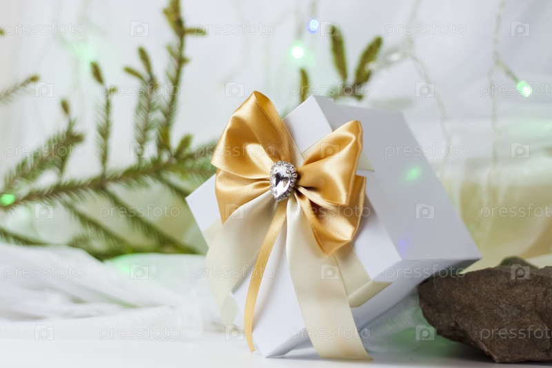 Рождественский подарок, украшенный красивым бантом на светлом фоне с веточкой, если. Выборочный фокус. концепция Рождества и Нового года