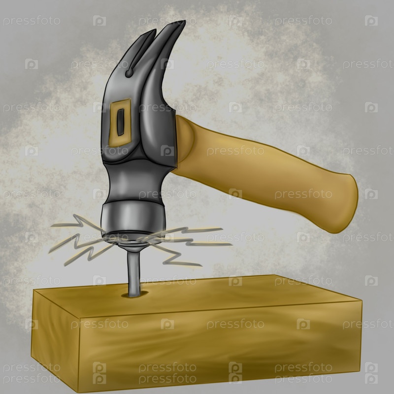 Молоток забивает гвоздь в кусок дерева на изолированном фоне. Клипарт инструменты