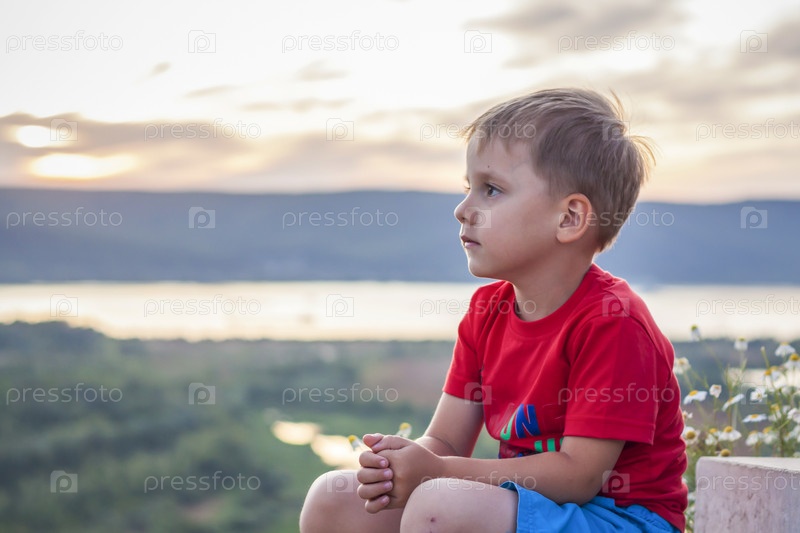 Симпатичный мальчик в красной футболке на фоне потрясающего заката. Путешествие. Лицо выражает естественные радостные эмоции. Не постановочные фото с натуры