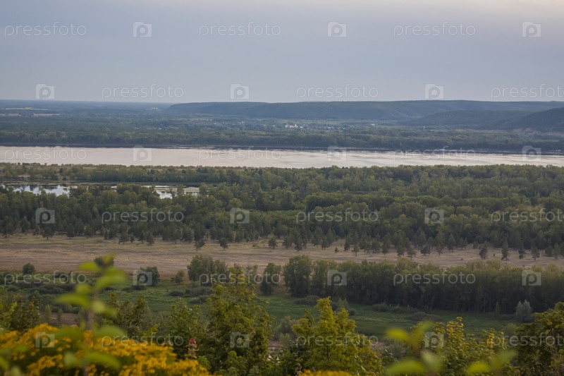 Закат на реке Волге. Природный ландшафт. отражение, голубое небо и желтый солнечный свет. пейзаж во время заката