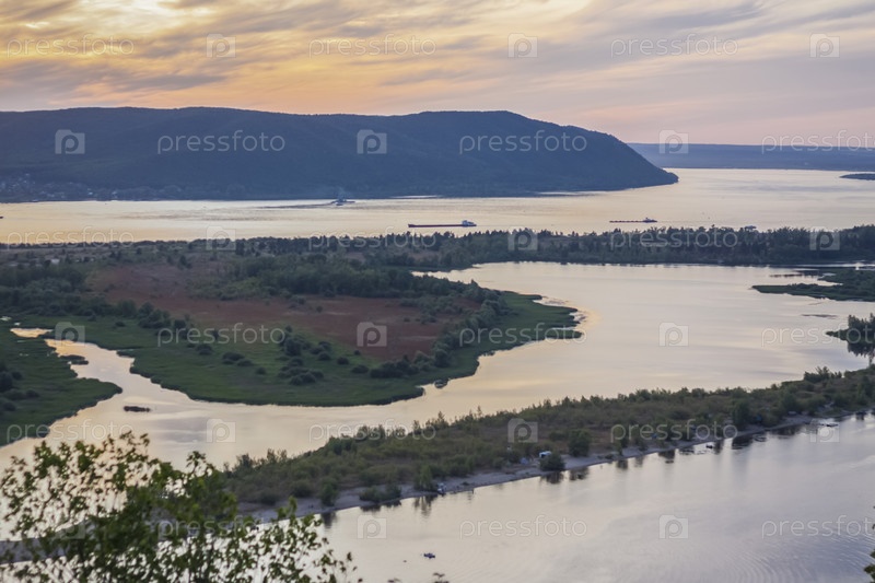 Закат на реке Волге. Природный ландшафт. отражение, голубое небо и желтый солнечный свет. пейзаж во время заката