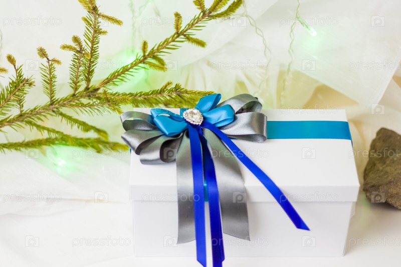 Рождественский подарок, украшенный красивым бантом на светлом фоне с веточкой, если. Выборочный фокус. концепция Рождества и Нового года