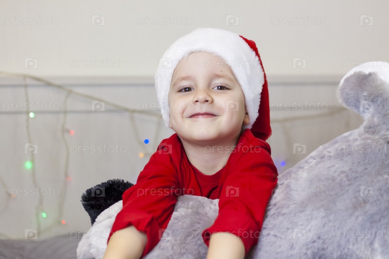 Портрет милого мальчика в шапке Санта-Клауса. Забавный улыбающийся ребенок. Подарки, игрушки, радость, праздник