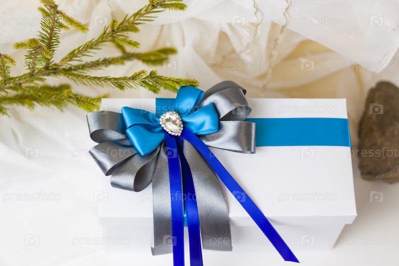 Рождественский подарок, украшенный красивым бантом на светлом фоне с веточкой, если. Выборочный фокус. концепция Рождества и Нового года