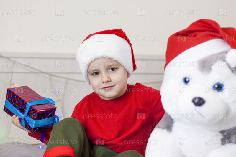Портрет милого мальчика в шапке Санта-Клауса. Забавный улыбающийся ребенок. Подарки, игрушки, радость, праздник