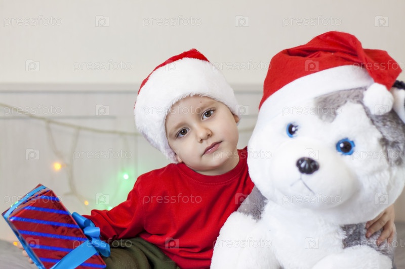 Портрет милого мальчика в шапке Санта-Клауса. Забавный улыбающийся ребенок. Подарки, игрушки, радость, праздник