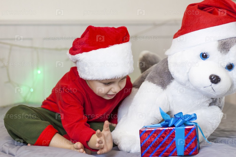 Портрет милого мальчика в шапке Санта-Клауса. Забавный улыбающийся ребенок. Подарки, игрушки, радость, праздник