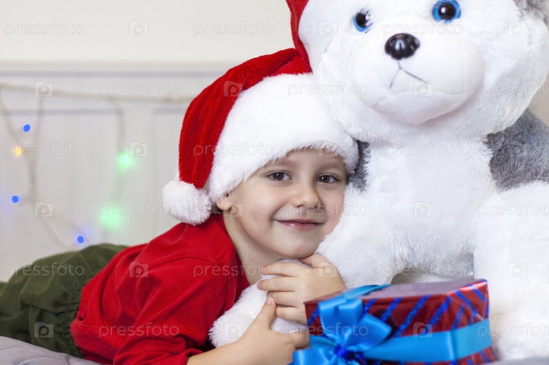 Портрет милого мальчика в шапке Санта-Клауса. Забавный улыбающийся ребенок. Подарки, игрушки, радость, праздник