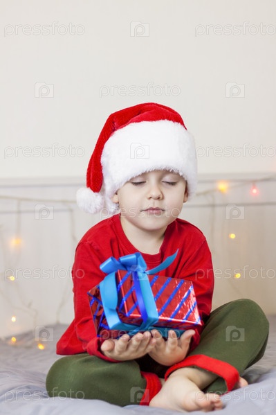 Портрет милого мальчика в шапке Санта-Клауса. Забавный улыбающийся ребенок. Подарки, игрушки, радость, праздник