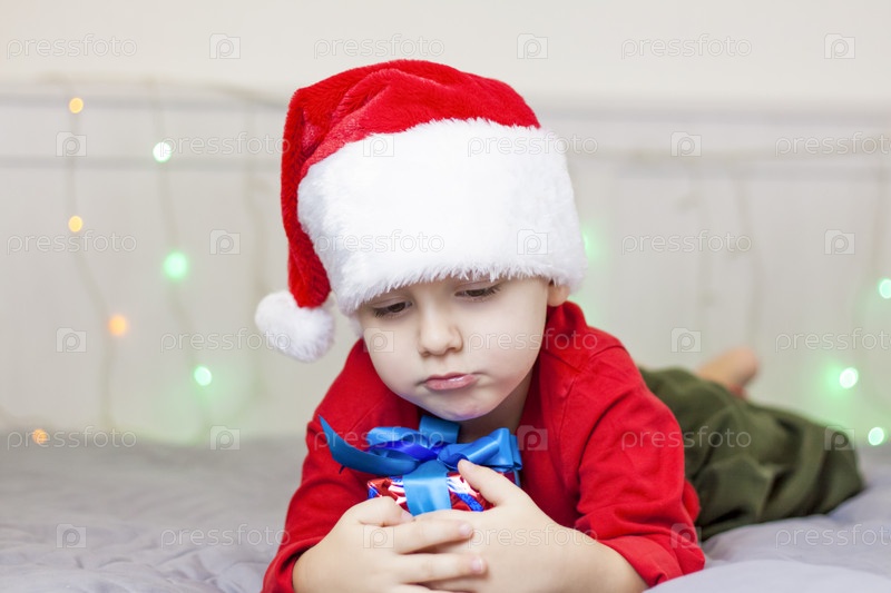 Портрет милого мальчика в шапке Санта-Клауса. Забавный улыбающийся ребенок. Подарки, игрушки, радость, праздник