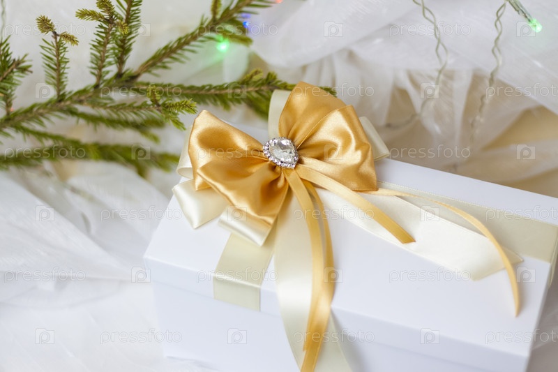 Рождественский подарок, украшенный красивым бантом на светлом фоне с веточкой, если. Выборочный фокус. концепция Рождества и Нового года