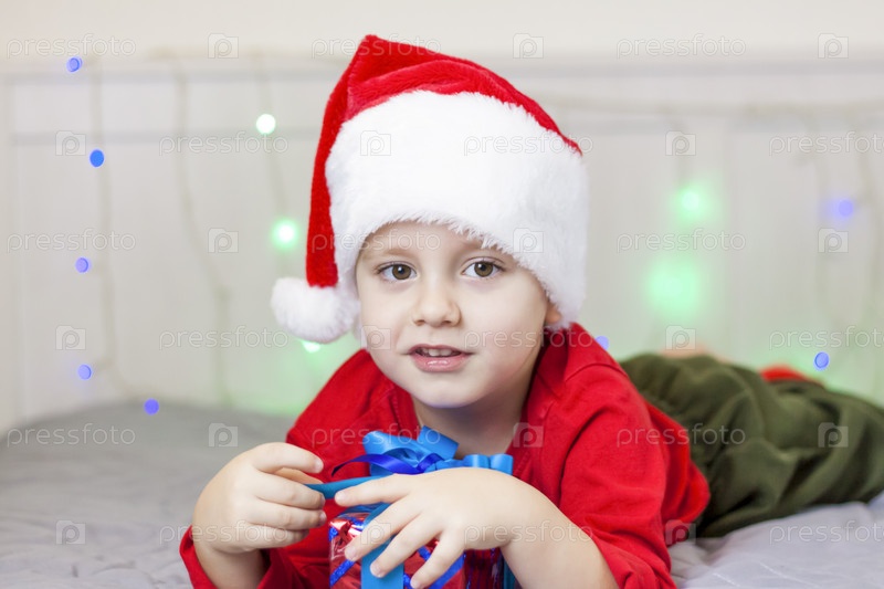 Портрет милого мальчика в шапке Санта-Клауса. Забавный улыбающийся ребенок. Подарки, игрушки, радость, праздник