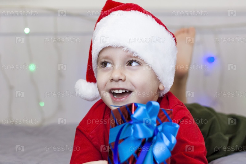 Портрет милого мальчика в шапке Санта-Клауса. Забавный улыбающийся ребенок. Подарки, игрушки, радость, праздник