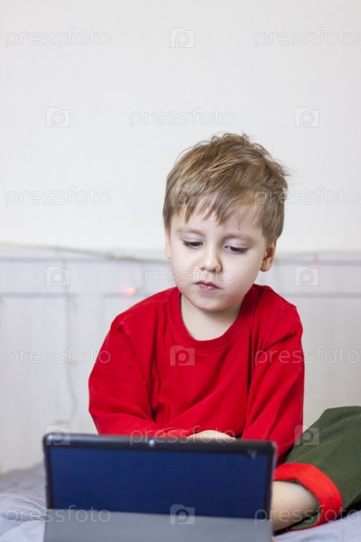 Симпатичный мальчик лежит на кровати и смотрит на планшет. Онлайн обучение, общение в интернете. Забавный улыбающийся ребенок