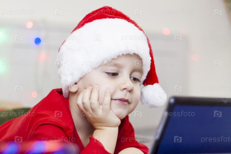 Симпатичный мальчик лежит в постели и смотрит на планшет. Забавный улыбающийся ребенок. В шапке Деда Мороза