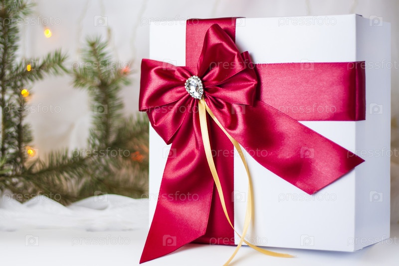 Рождественский подарок, украшенный красивым бантом на светлом фоне с еловой веткой. Подарки, радость, сюрприз. Выборочный фокус. концепция Рождества и Нового года