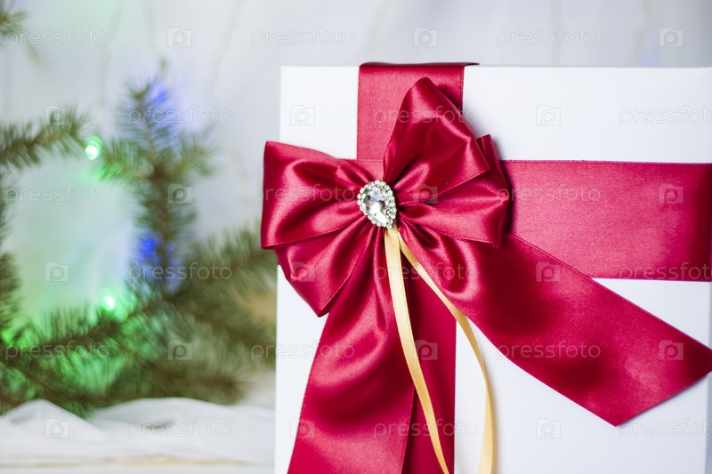 Рождественский подарок, украшенный красивым бантом на светлом фоне с еловой веткой. Подарки, радость, сюрприз. Выборочный фокус. концепция Рождества и Нового года