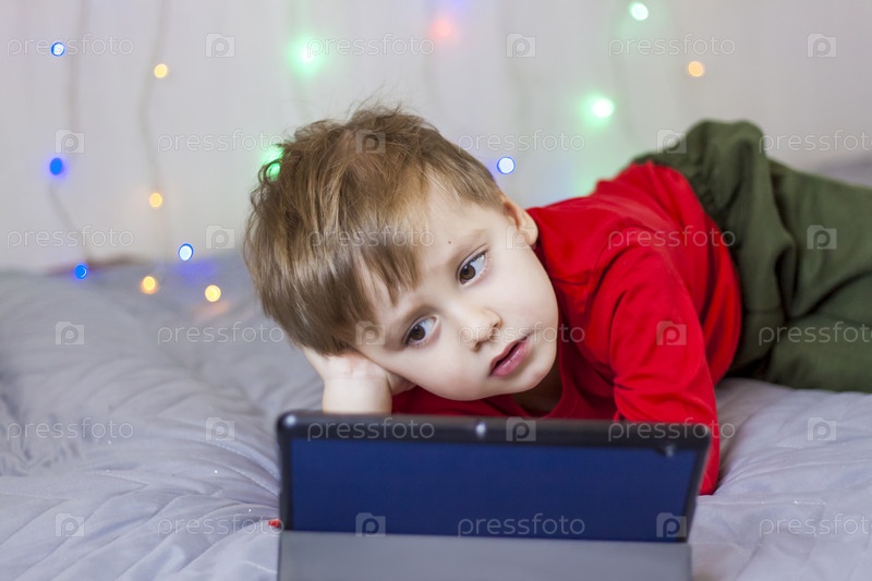 Симпатичный мальчик лежит на кровати и смотрит на планшет. Онлайн обучение, общение в интернете. Забавный улыбающийся ребенок