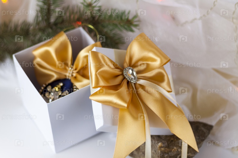 Рождественский подарок, украшенный красивым бантом на светлом фоне с еловой веткой. Подарки, радость, сюрприз. Выборочный фокус. концепция Рождества и Нового года