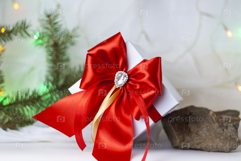 Рождественский подарок, украшенный красивым бантом на светлом фоне с еловой веткой. Подарки, радость, сюрприз. Выборочный фокус. концепция Рождества и Нового года