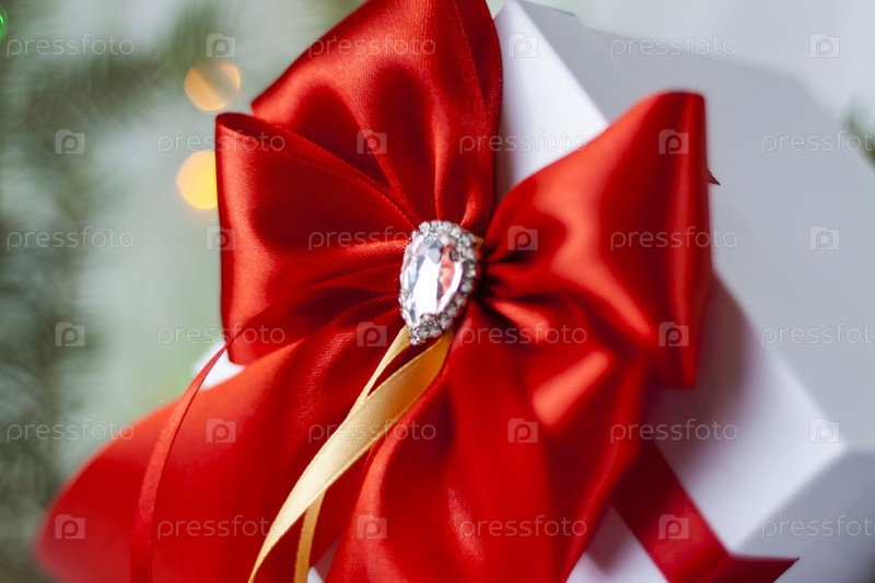 Рождественский подарок, украшенный красивым бантом на светлом фоне с еловой веткой. Подарки, радость, сюрприз. Выборочный фокус. концепция Рождества и Нового года