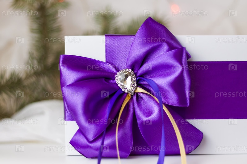 Рождественский подарок, украшенный красивым бантом на светлом фоне с еловой веткой. Подарки, радость, сюрприз. Выборочный фокус. концепция Рождества и Нового года