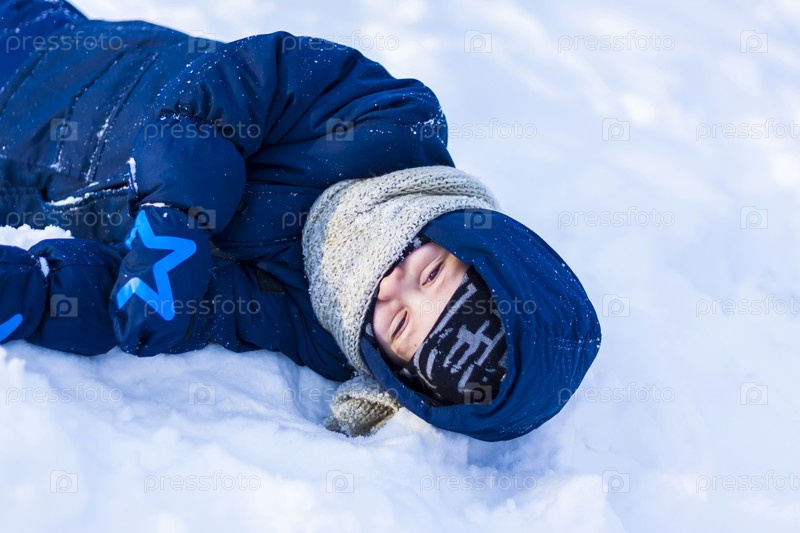 Улыбающийся счастливый ребенок лежит в сугробе в солнечный зимний день. Снега много и очень морозно. Активные зимние подвижные игры