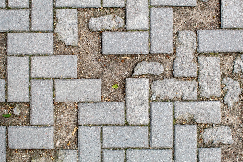 Тротуар с разбитой сломанной плиткой. Текстура светло-серого кирпича