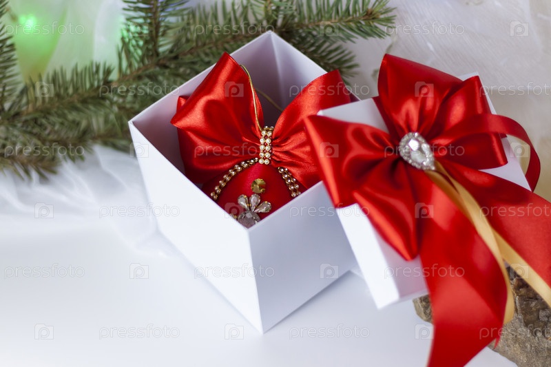 Рождественский подарок, украшенный красивым бантом на светлом фоне с еловой веткой. Подарки, радость, сюрприз. Выборочный фокус. концепция Рождества и Нового года