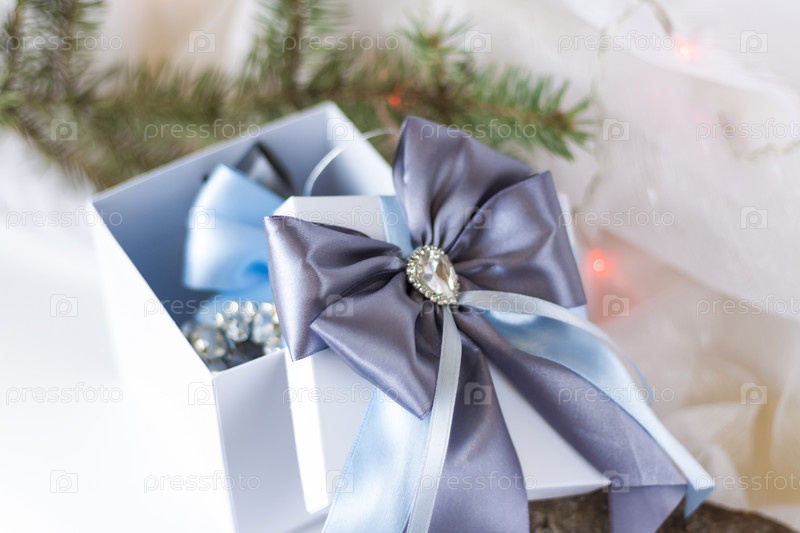 Рождественский подарок, украшенный красивым бантом на светлом фоне с еловой веткой. Подарки, радость, сюрприз. Выборочный фокус. концепция Рождества и Нового года