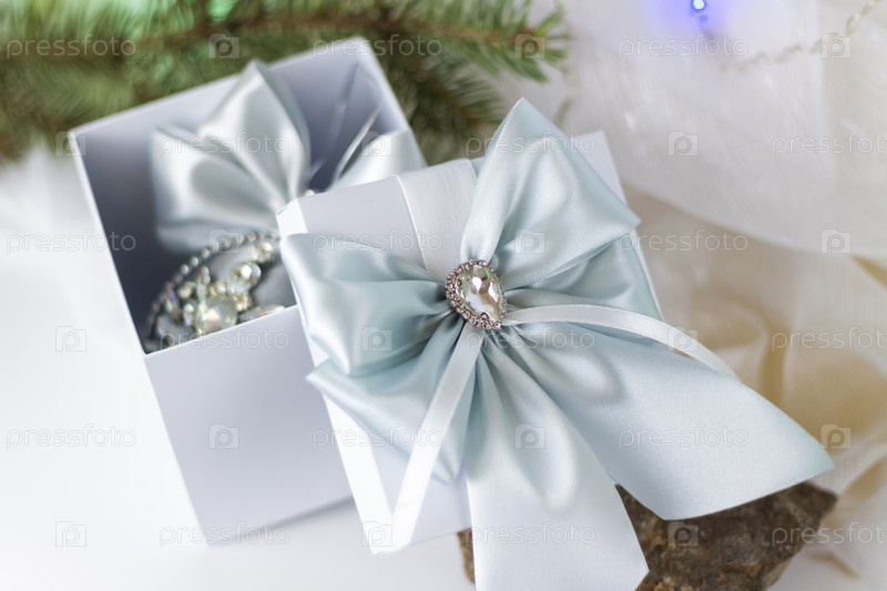 Рождественский подарок, украшенный красивым бантом на светлом фоне с еловой веткой. Подарки, радость, сюрприз. Выборочный фокус. концепция Рождества и Нового года